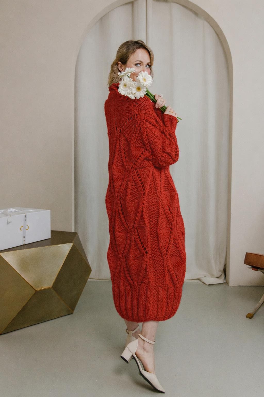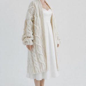 Features: • Handmade from soft alpaca/mohair yarn • Long, flowing silhouette for elegant layering • Delicate embroidery with 18K golden threads • Lightweight, cozy, and airy for comfortable wear • Unique design combining luxury and artisanal craftsmanship