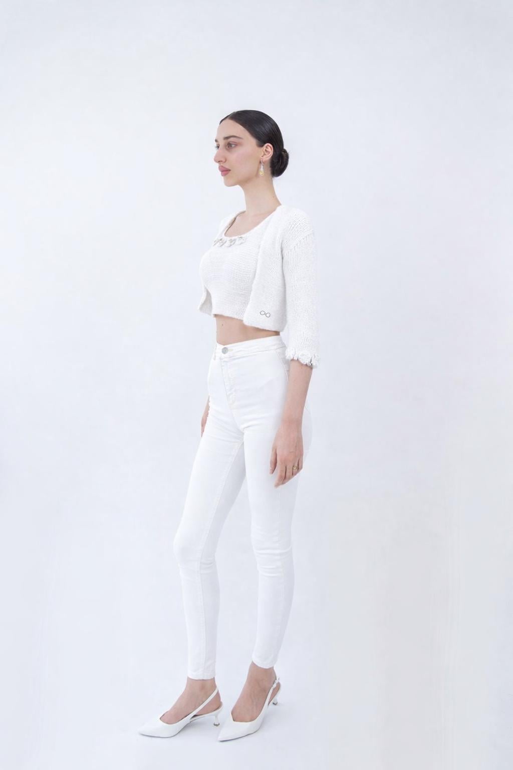 Features: • Handmade from 100% pure cashmere • Cropped cardigan with 3/4 sleeves + matching sleeveless top • Soft, breathable, lightweight, and luxurious • Delicate cuff details for an elegant touch • Unique handmade design