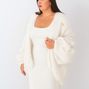 This hand-knitted white cropped cardigan is the perfect elegant cover-up for weddings, evening parties, or any special occasion. Made with soft, airy yarn, it features a delicate open-knit texture and voluminous balloon sleeves for a modern yet timeless silhouette. Lightweight, cozy, and feminine, this cardigan layers beautifully over dresses without hiding your look. A versatile piece that adds a touch of sophistication — ideal for brides, bridesmaids, or anyone who loves handmade luxury knitwear. Care instructions: Hand wash only max 30 degrees, do not iron, do not tumble dry, dry flat. About the process: The knitting process takes around 2-3 weeks. I work every 3 months from Germany and 3 months from Georgia. The carrier is DHL, if necessary an express option can be booked.