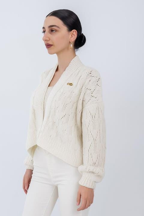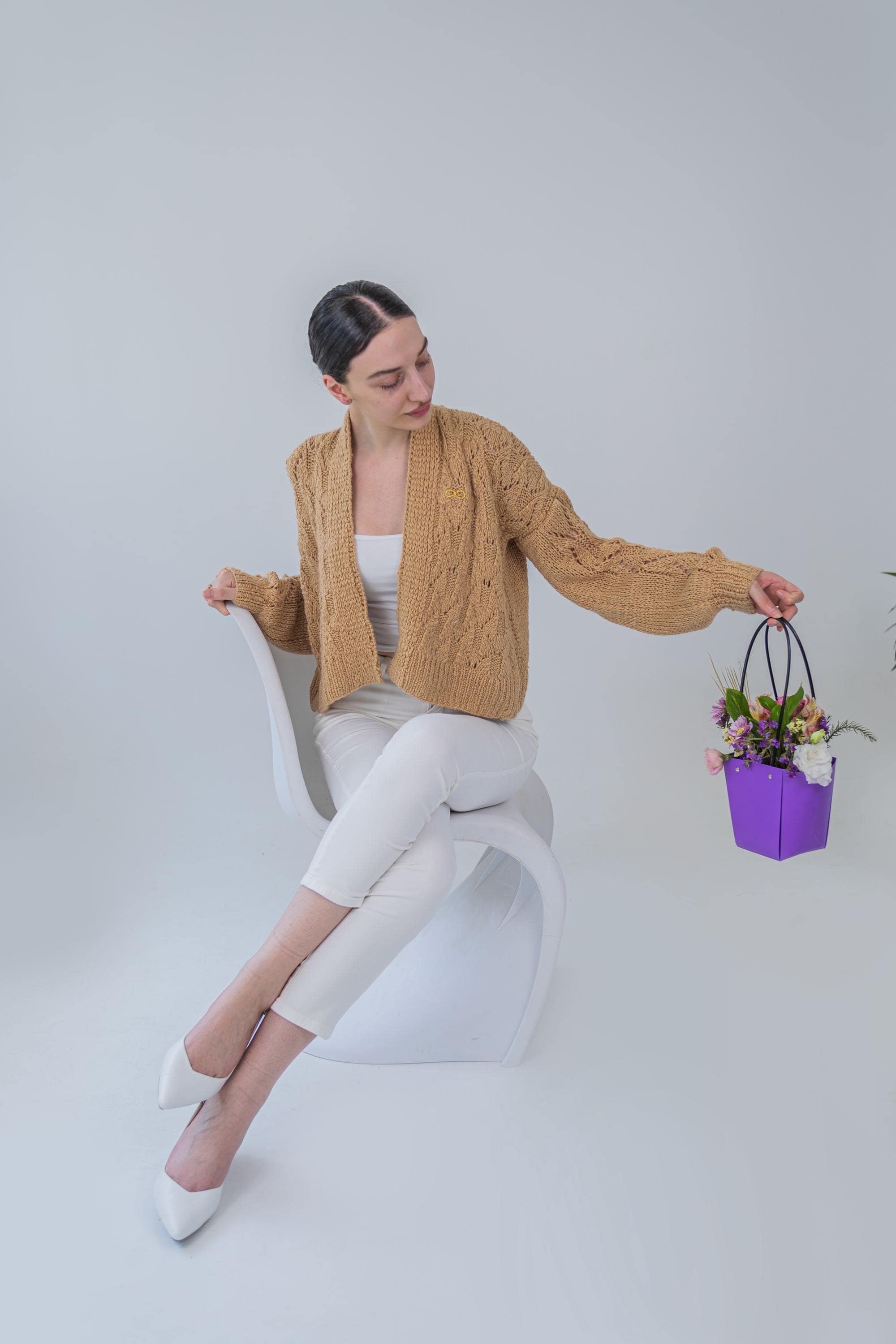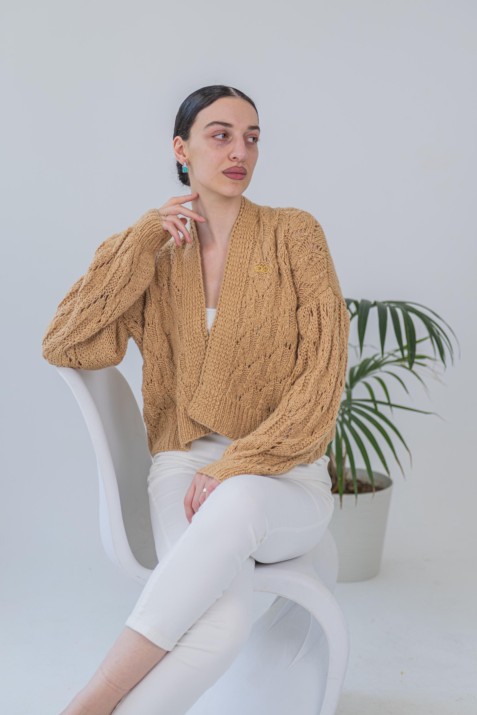 Elegant and versatile, this hand-knitted cashmere set includes a cropped cardigan with balloon sleeves and a matching knit top. Made from pure cashmere, it feels soft, breathable, and lightweight — perfect for layering.