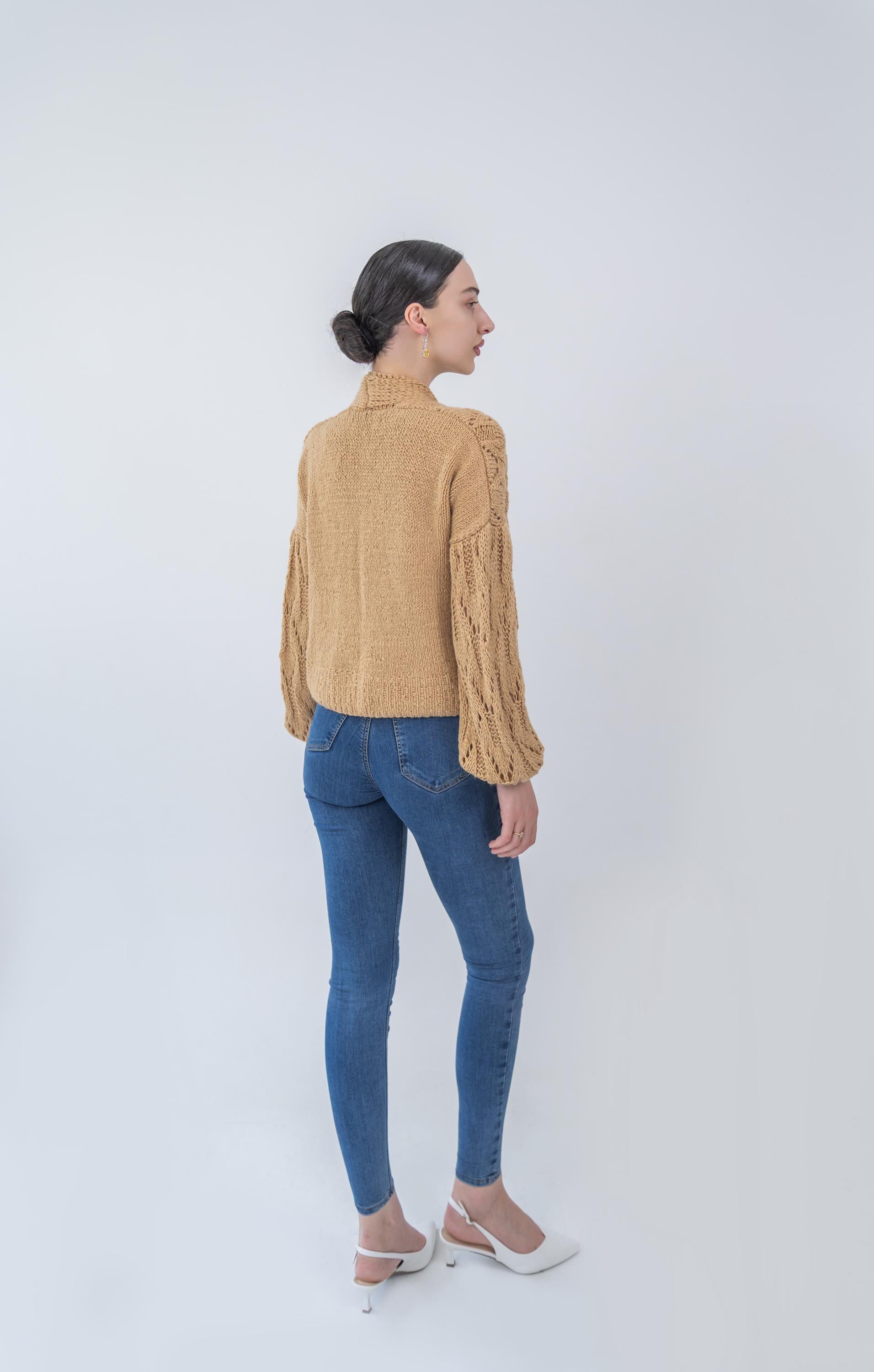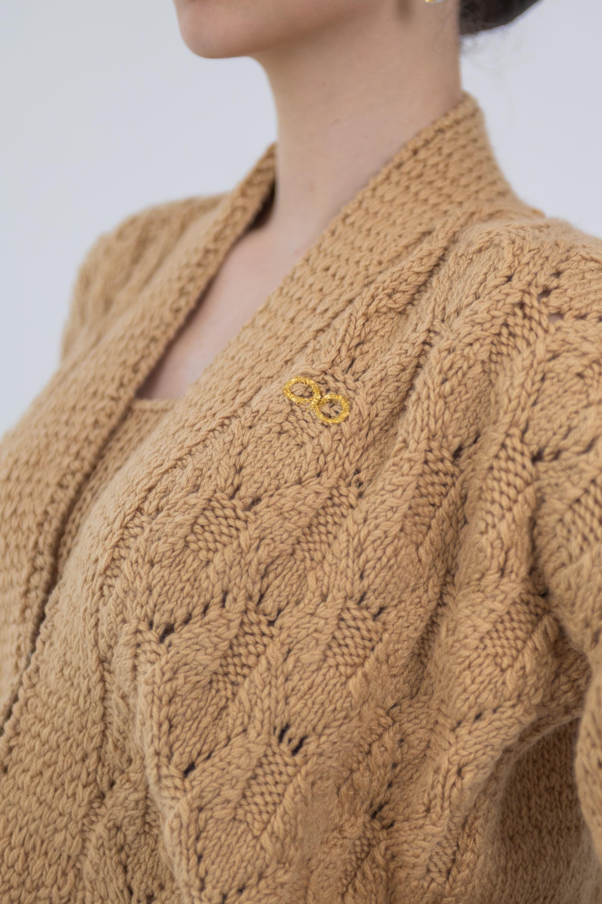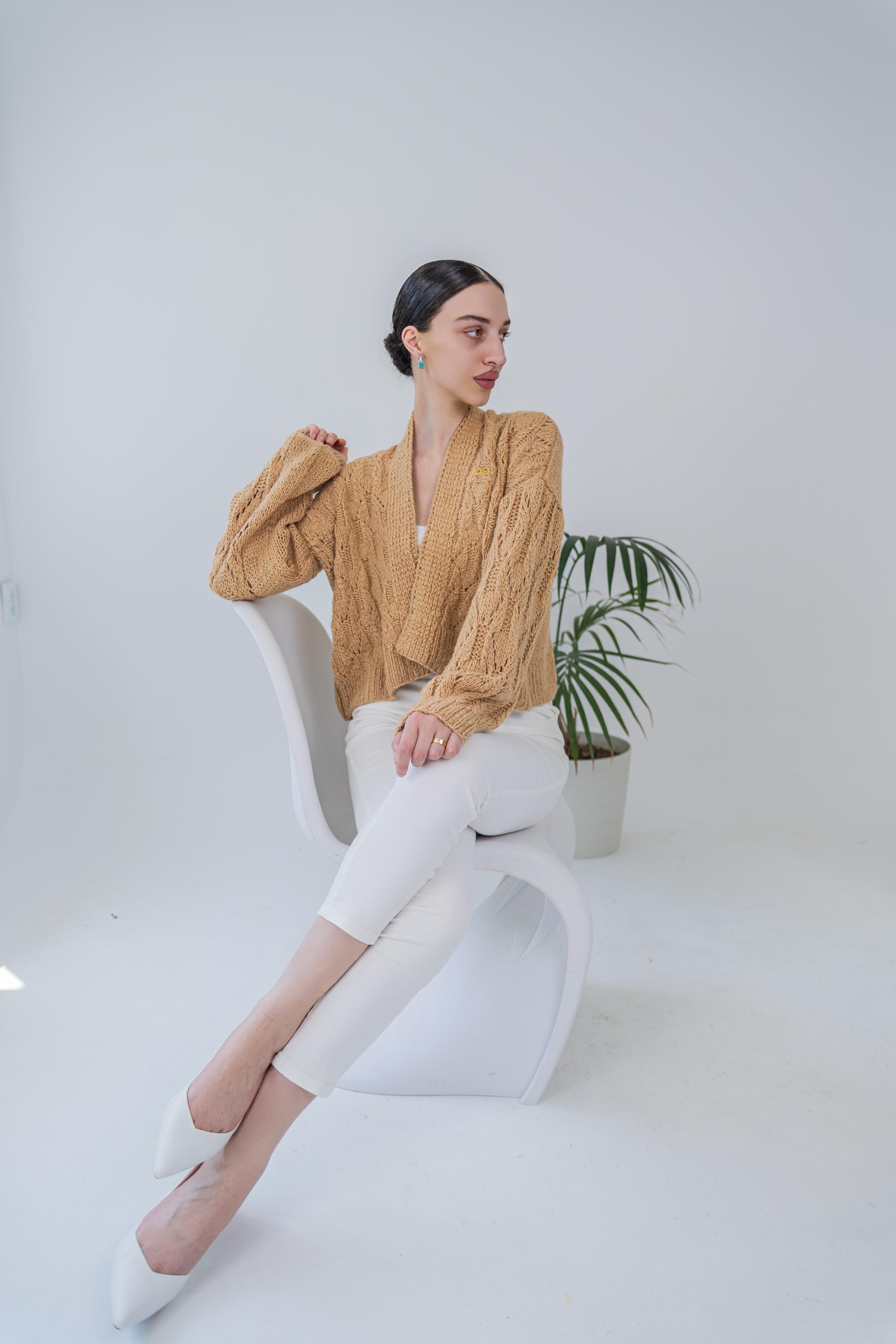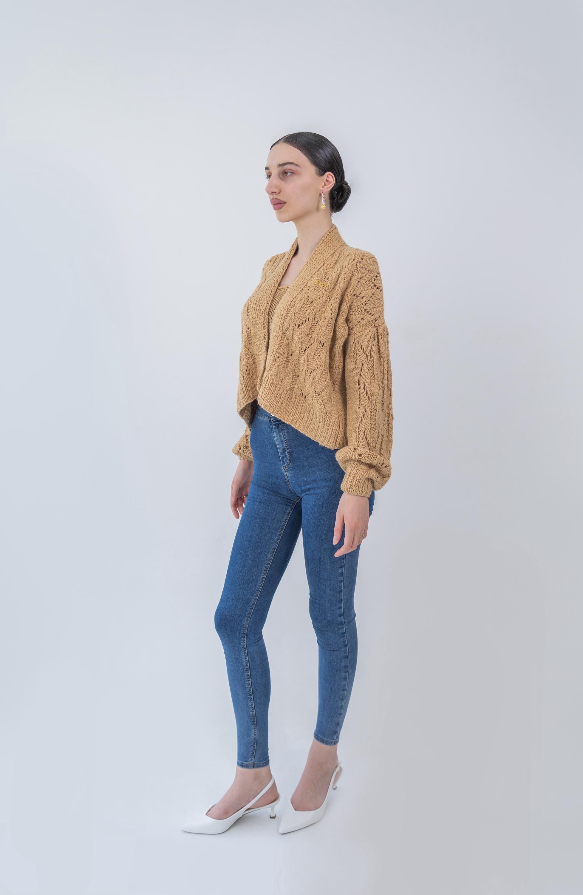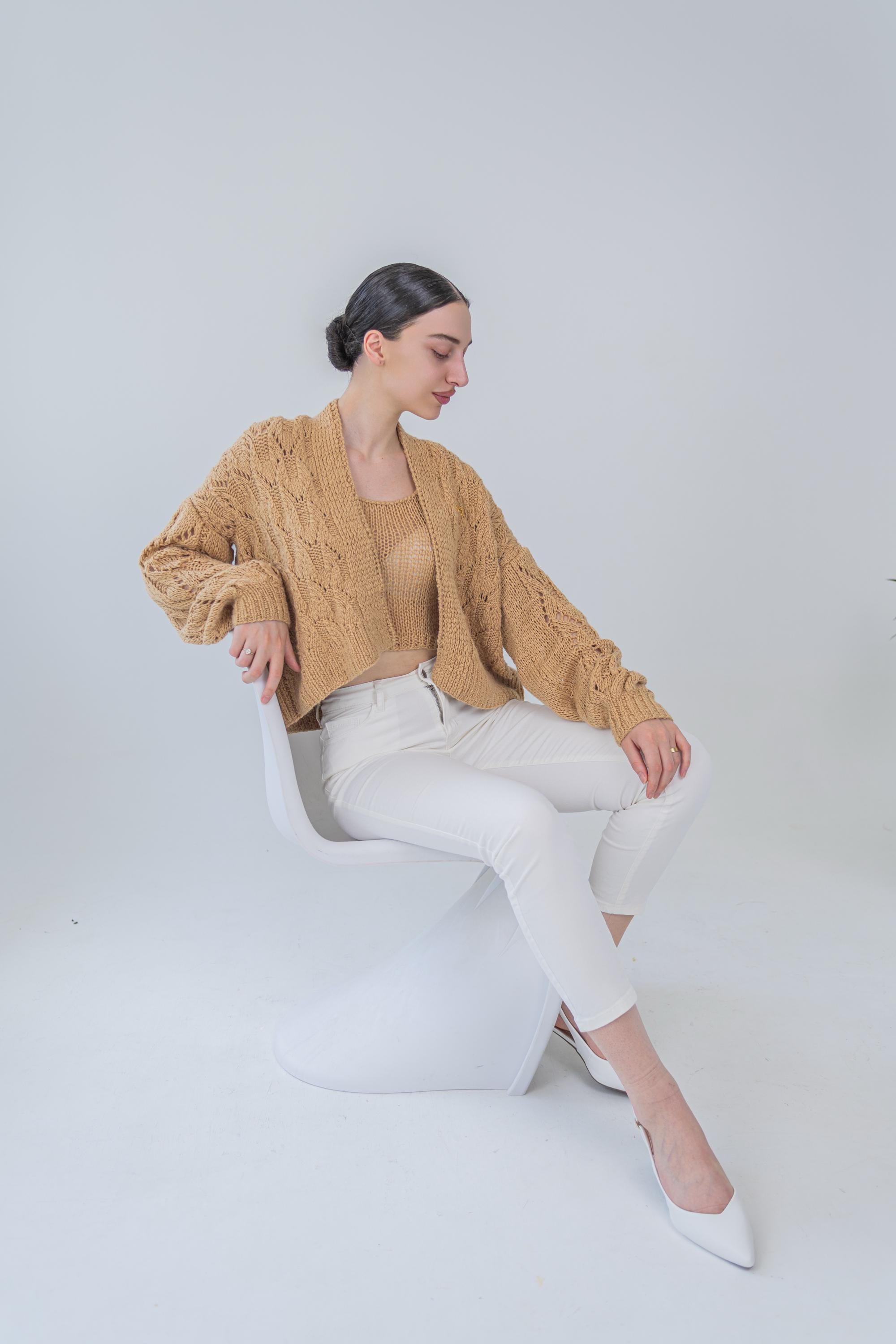 Elegant and versatile, this hand-knitted cashmere set includes a cropped cardigan with balloon sleeves and a matching knit top. Made from pure cashmere, it feels soft, breathable, and lightweight — perfect for layering.