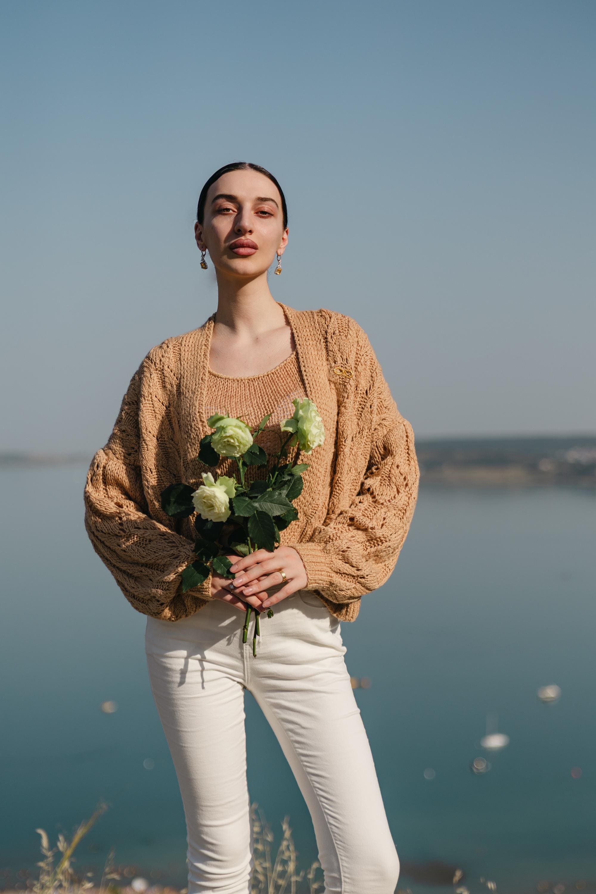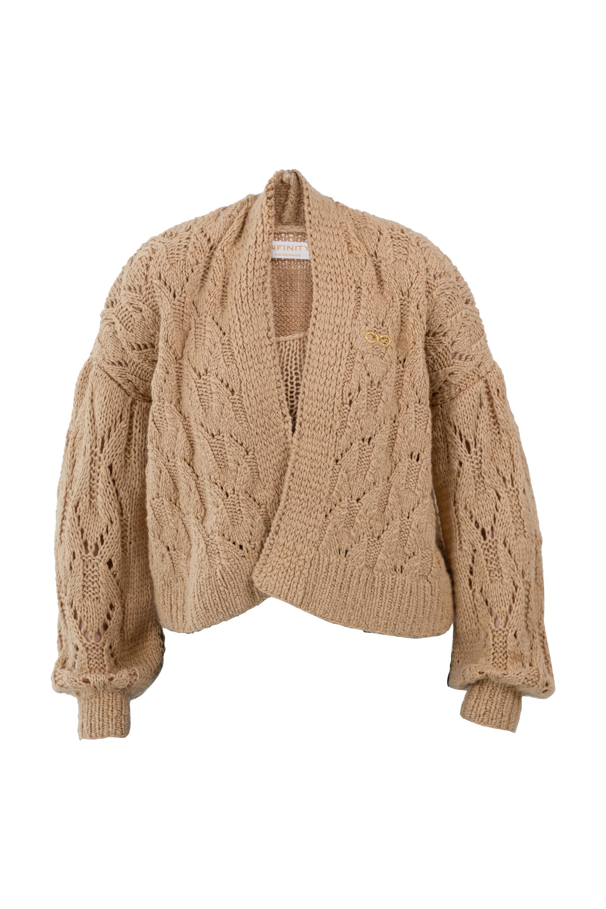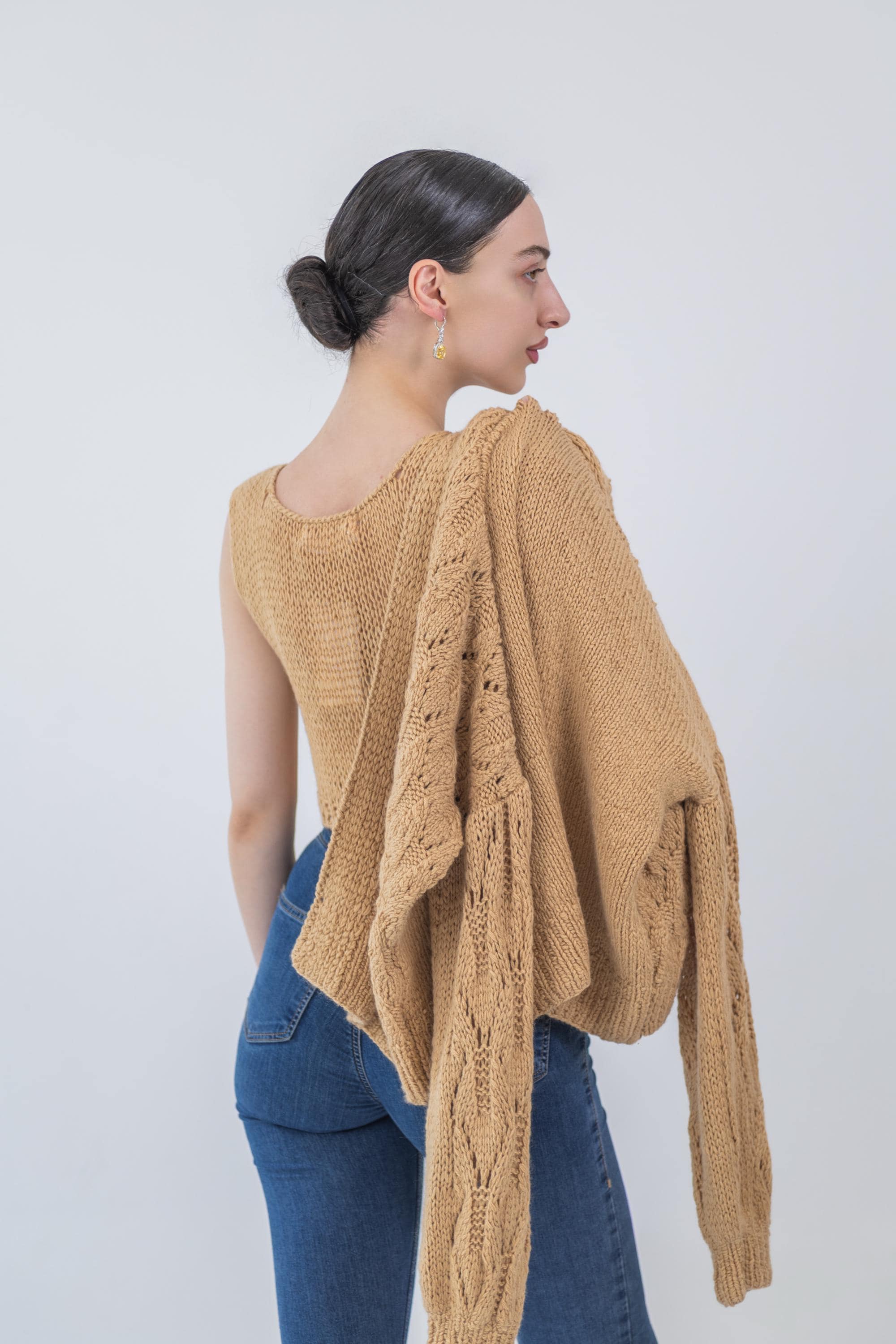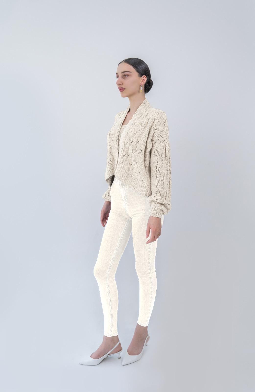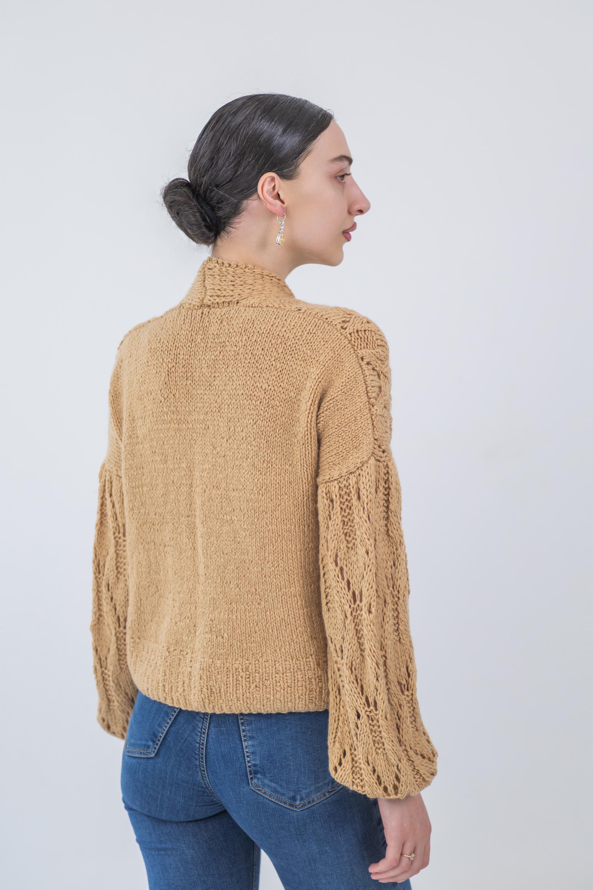 Elegant and versatile, this hand-knitted cashmere set includes a cropped cardigan with balloon sleeves and a matching knit top. Made from pure cashmere, it feels soft, breathable, and lightweight — perfect for layering.
